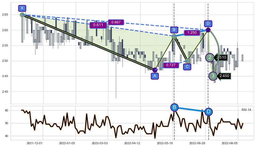 ➢ 谐波价格D点比B点高 ⤴,【RSI】指标D点比B点低 ⤵️