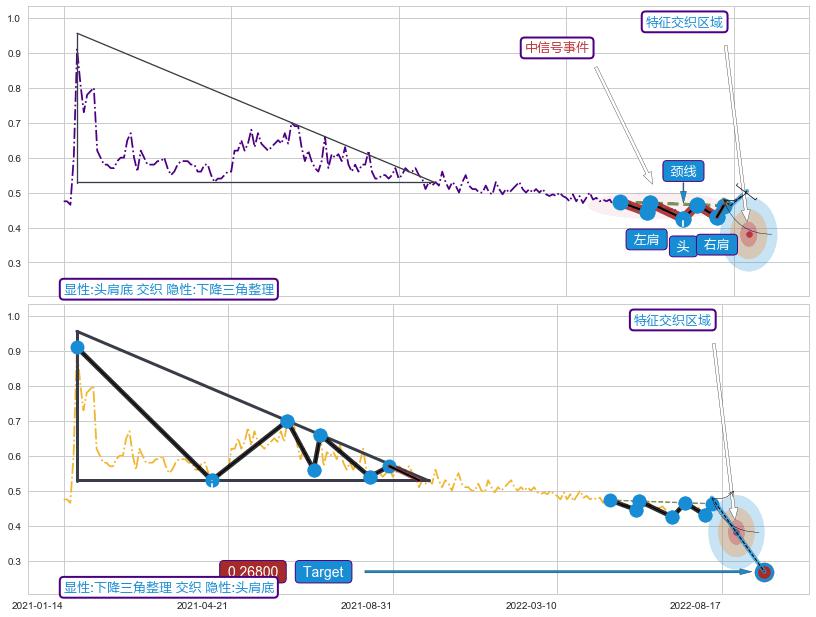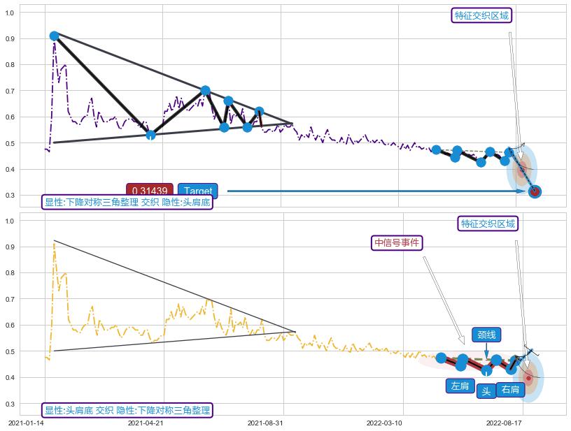 ➢ 下降对称三角整理:猜想预期下跌目标target即将达成,随后猜想强支撑来临,预期反弹上涨(均值回复)