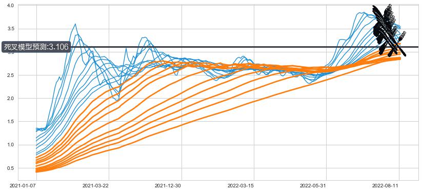 ➣ 40小时均线于(2022-07-28: 3.500)形成【死叉】基于【死叉历史模型】预测死叉后最低波谷价格: 3.259, 死叉后最低价格2.910,已经下跌超出预测最低波谷价格, 预期反弹