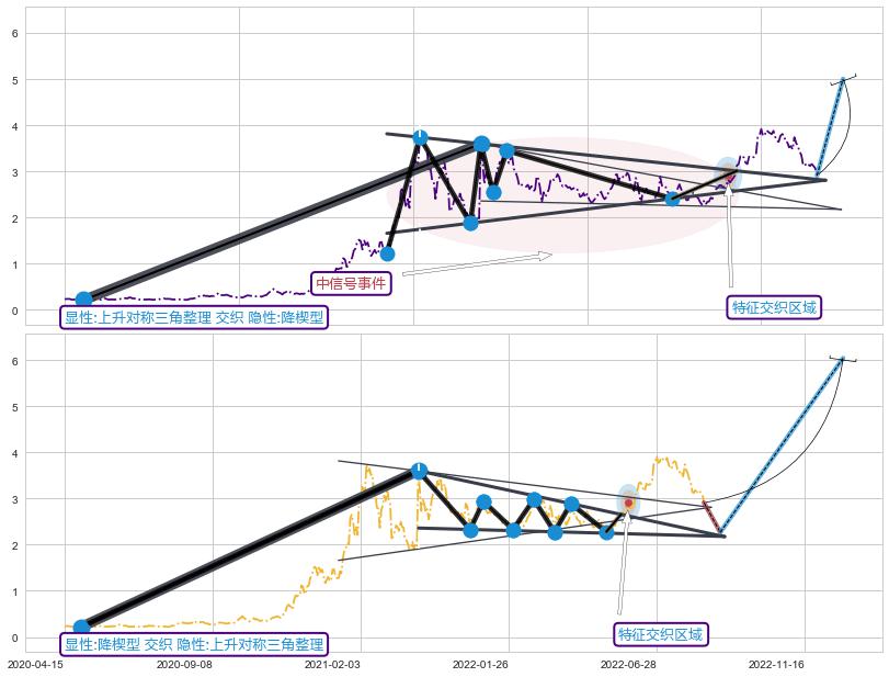 ➣ 上涨螺旋桨形态 + 上升对称三角整理阻力突破转换支撑上涨信号叠加后【目标达成率】中等,【看多】信号叠加【存续影响中等】