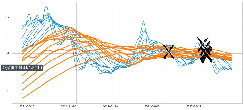 ➣ 13小时均线于(2022-06-23: 1.4969)形成【死叉】基于【死叉历史模型】预测死叉后最低波谷价格: 1.4165, 死叉后最低价格1.1400,已经下跌超出预测最低波谷价格, 预期反弹