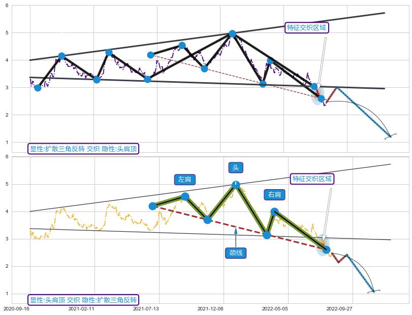 ➣ 扩散三角反转:关键支撑位被击穿 → 猜想形成趋势持续下跌 → 风险信号 → 大趋势均值回复