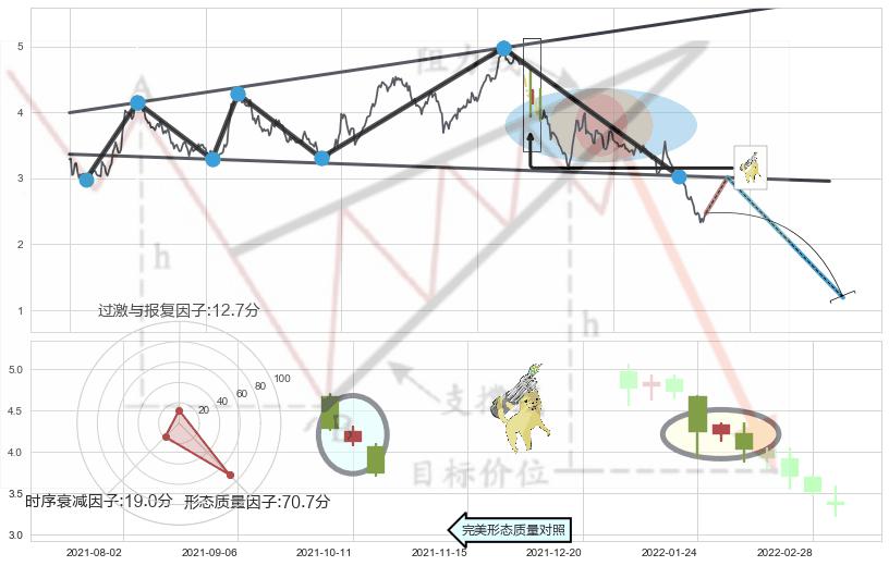 ➣ 下跌螺旋桨 + 头肩顶支撑破位转换阻力下跌信号叠加后【目标达成率】低,【看空】信号叠加【存续影响大】