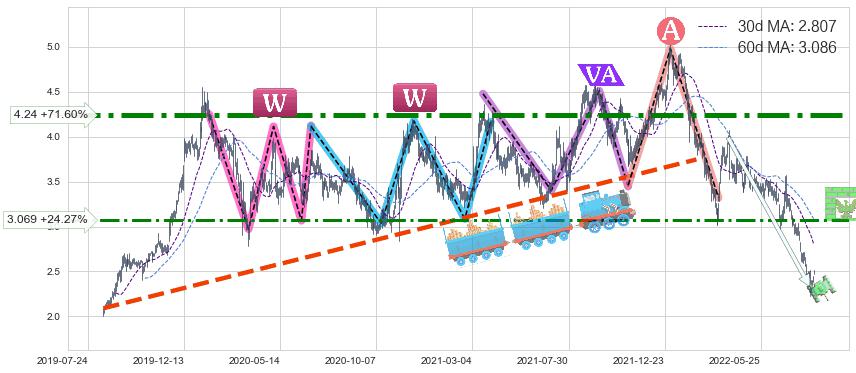 ♘ 阻力价格位3.069,可信任强度69.60%,距离最后交易2022-08-12形成的收盘价格2.470相差 +24.27%