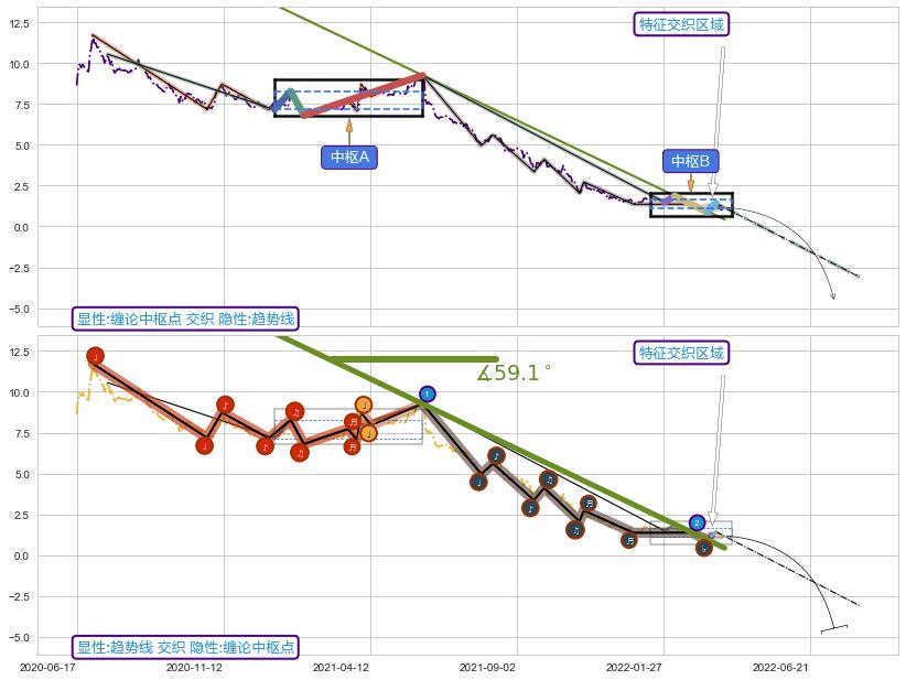 ➣ 缠论中枢点:猜想破位中枢B后持续下拉 → 下跌 → 破位中枢B支撑 → 持续趋势跟踪