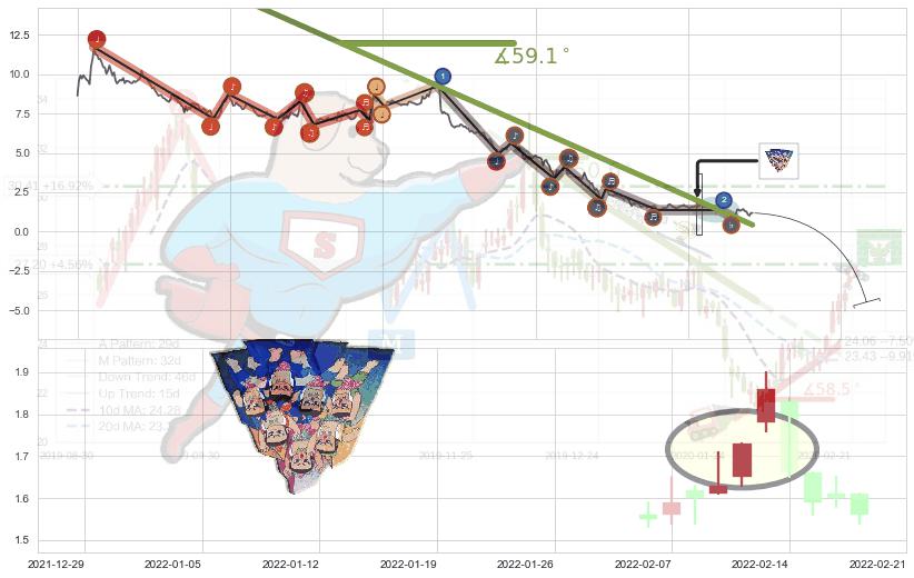 从2021-05-24至2022-03-31,共包含214个交易日,阶段股价下跌-165.36%,阶段股价变动位移路程比: 1 : 5,下跌趋势角度: 47.2