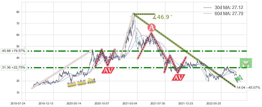 ♘ 阻力价格位45.88,可信任强度70.69%,距离最后交易2022-08-12形成的收盘价格25.55相差 +79.57%