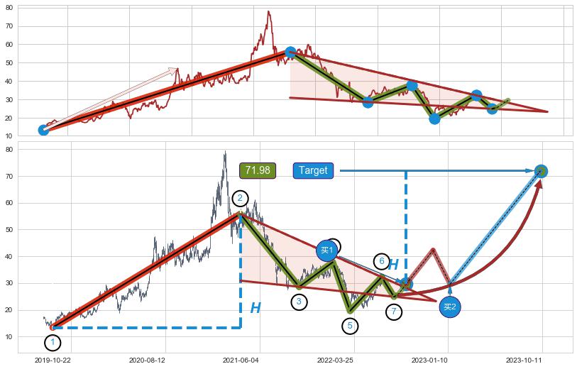 ➢ 降楔型:猜想临近关键阻力位突破点 → 临近拐点上涨 → 机会信号 → 大趋势均值回复