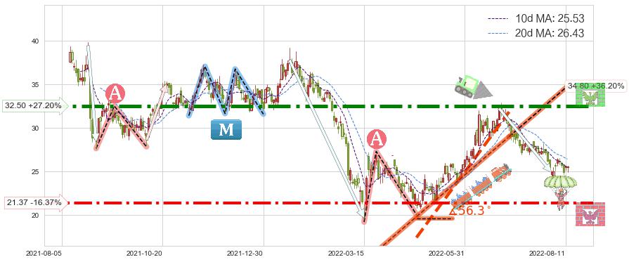 ♘ 支撑价格位21.37,可信任强度77.15%,距离最后交易2022-08-12形成的收盘价格25.55相差 -16.37%