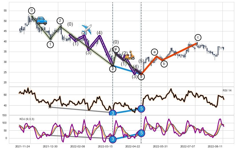 ➣ 波浪理论:猜想达到c点后小反弹终止反转下跌 → 下跌 → 【拐点】临近 → 阶段均值回复结束后继续大周期趋势跟踪