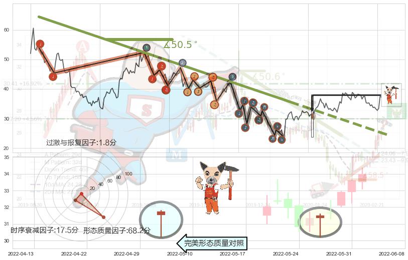 从2022-02-25至2022-05-03,共包含44个交易日,阶段股价下跌-21.69%,阶段股价变动位移路程比: 1 : 8,下跌趋势角度: 68.2