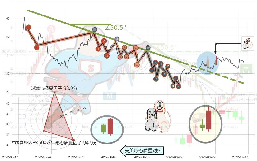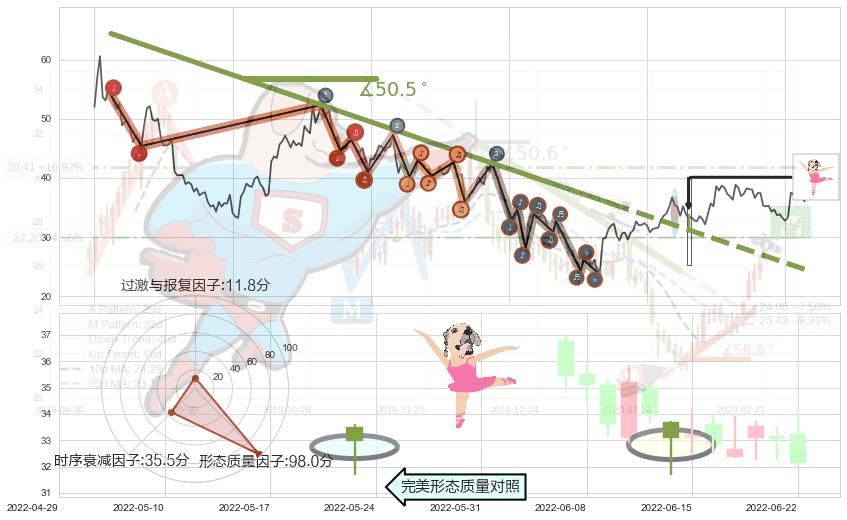 从2022-04-25至2022-07-22,共包含61个交易日,阶段股价上涨43.60%,阶段股价变动位移路程比: 1 : 4,上涨趋势角度: 43.6