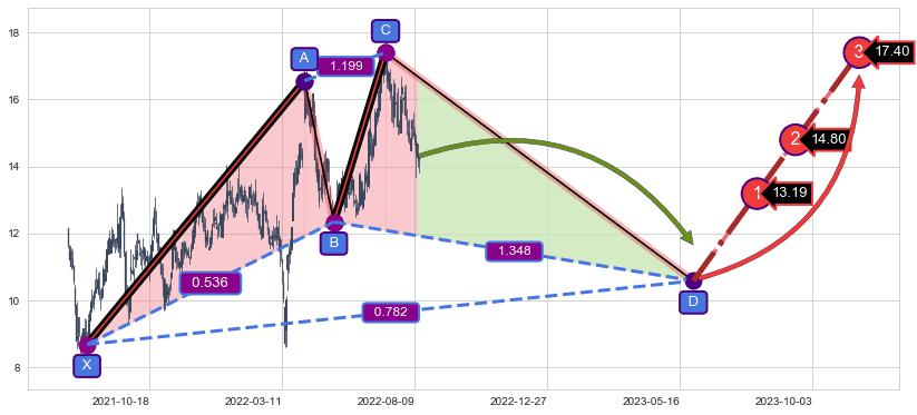 ➣ D点拟合预测价格10.58,距离最后交易收盘价格14.30相差 -26.01%