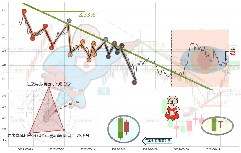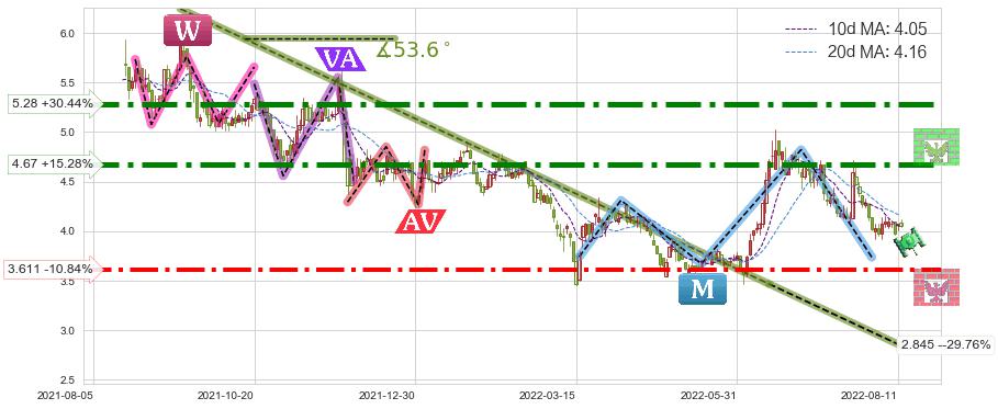 ♘ 阻力价格位4.67,可信任强度90.75%,距离最后交易2022-08-12形成的收盘价格4.05相差 +15.28%