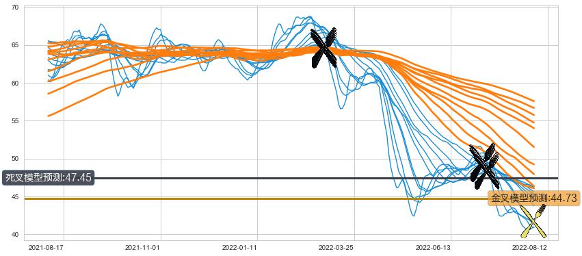 ➣ 45小时均线于(2022-07-08: 48.05)形成【死叉】基于【死叉历史模型】预测死叉后最低波谷价格: 42.18, 死叉后最低价格39.80,已经下跌超出预测最低波谷价格, 预期反弹