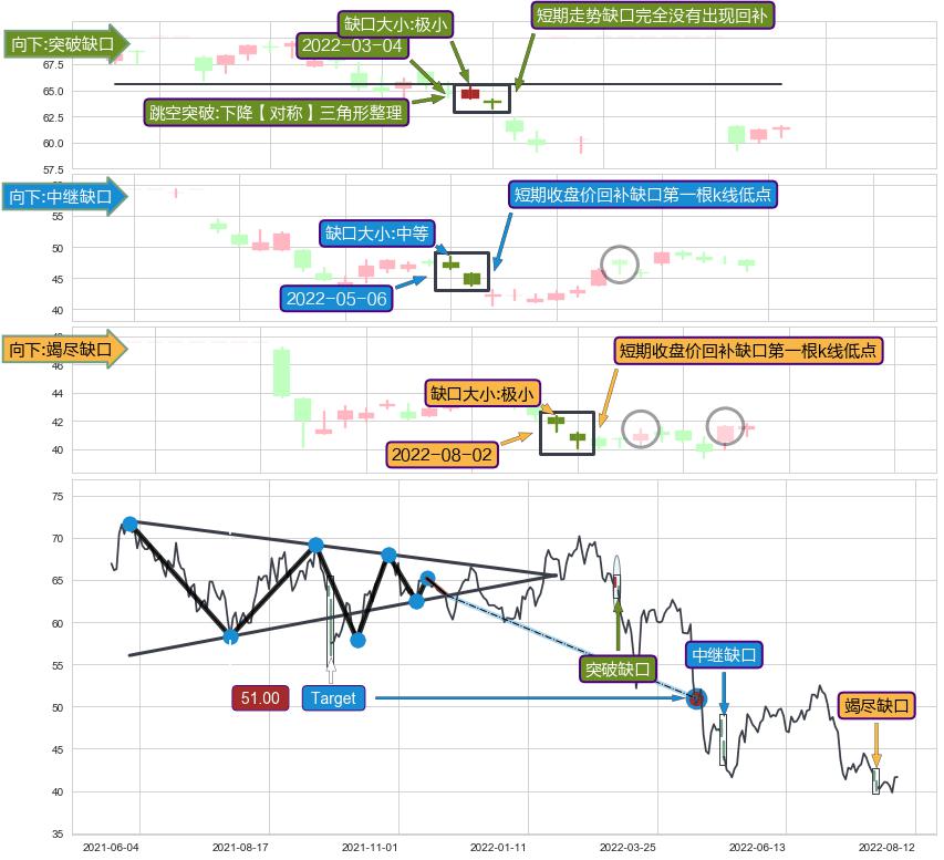 ➣ 普通缺口在【下降【对称】三角形整理】震荡整理形态中出现