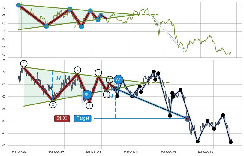 ➣ 最小中继整理跌幅→𝐇: 25.00 (下侧直角边第一支撑点②与斜边垂直距离)