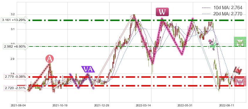 ♘ 支撑价格位2.779,可信任强度87.64%,距离最后交易2022-08-12形成的收盘价格2.790相差 -0.38%