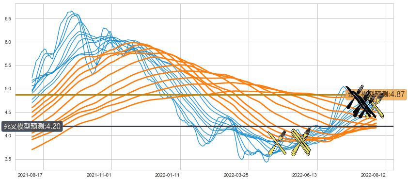 ➣ 40小时均线于(2022-08-03: 4.62)形成【死叉】基于【死叉历史模型】预测死叉后最低波谷价格: 4.05, 死叉后最低价格4.53,尚未达到预测最低波谷价格, 预期继续下跌