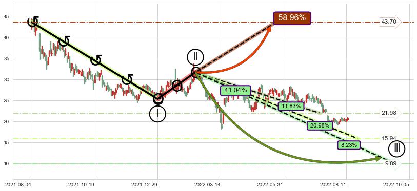 ➢ 循环浪继续向下【最高】位置(2022-07-13, 21.98),匹配聚类样本比例28.82%, 可能性概率11.83%