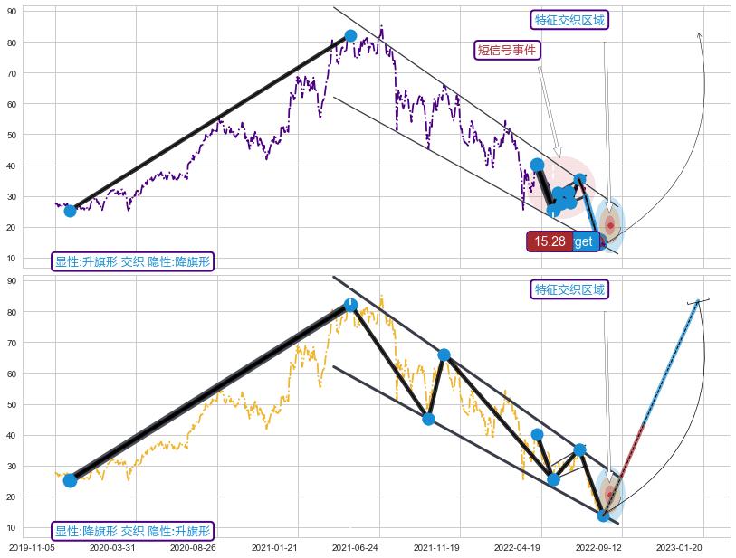 ➣ 降旗形:猜想临近关键阻力位突破点 → 临近拐点上涨 → 机会信号 → 大趋势均值回复