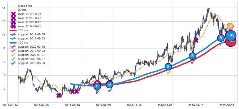 ➣ 105小时均线于(2020-07-15: 11.51)形成【死叉】基于【死叉历史模型】预测死叉后最低波谷价格: nan, 死叉后最低价格2.160,虽然已经到达预测最低波谷价格,但耗时间很短动能很强, 预期继续下跌