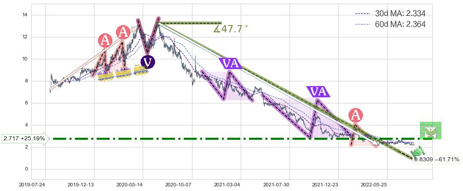 ♘ 阻力价格位2.717,可信任强度72.49%,距离最后交易2022-08-12形成的收盘价格2.170相差 +25.19%