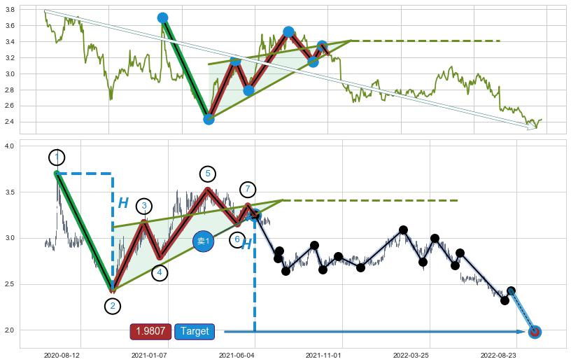 ➣ 升楔型:猜想预期下跌目标target即将达成,随后猜想强支撑来临,预期反弹上涨(均值回复)