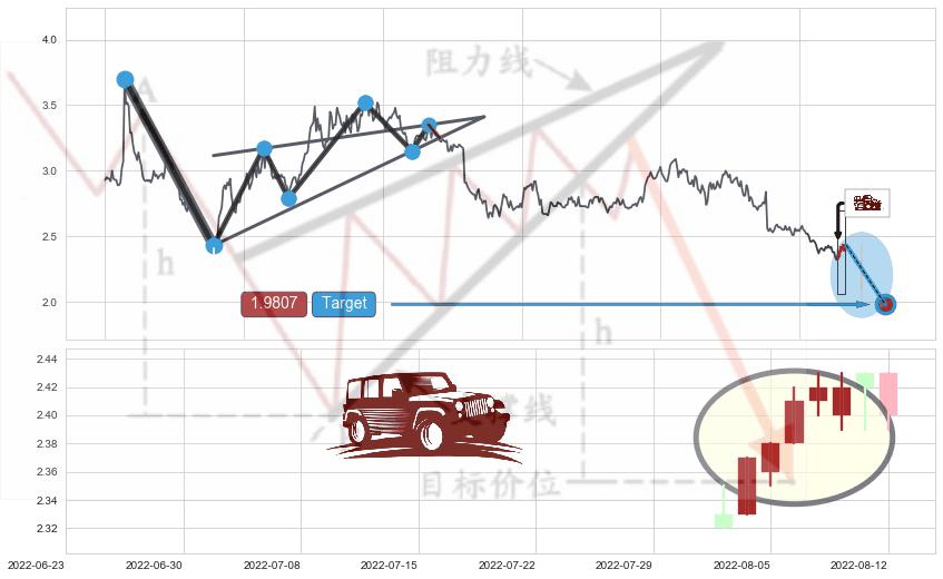 ♘ 阻力价格位2.657,可信任强度79.81%,距离最后交易2022-08-12形成的收盘价格2.430相差 +9.36%