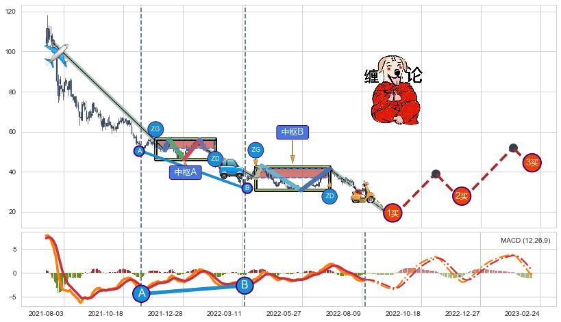➣ 缠论中枢点:下降缠中枢AB形成后猜想拐点1买即将出现,随后猜想后续持续拉升(均值回复)