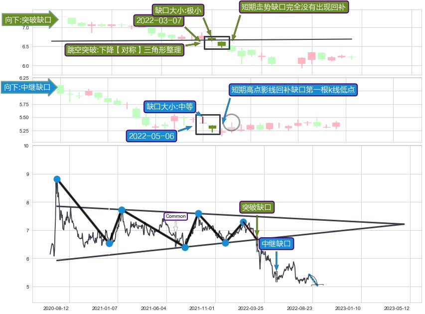 ➣ 普通缺口在【下降【对称】三角形整理】震荡整理形态中出现