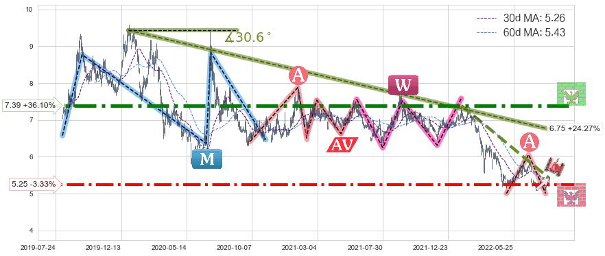 ♘ 阻力价格位7.39,可信任强度94.77%,距离最后交易2022-08-12形成的收盘价格5.43相差 +36.10%