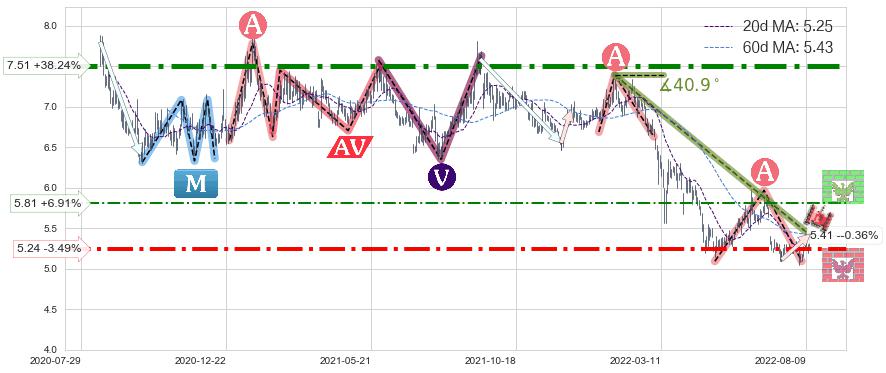 ♘ 阻力价格位5.81,可信任强度47.29%,距离最后交易2022-08-12形成的收盘价格5.43相差 +6.91%