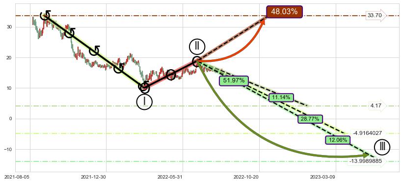 ➣ 缠论中枢点:猜想破位中枢B后持续下拉 → 下跌 → 破位中枢B支撑 → 持续趋势跟踪