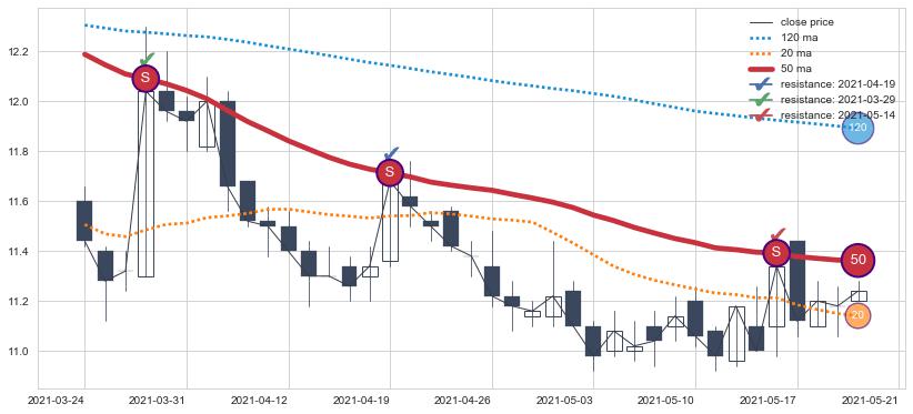 ➣ 历史趋势中共发现10处重要支撑阻力位,其中关键支撑位3处, 关键阻力位7处