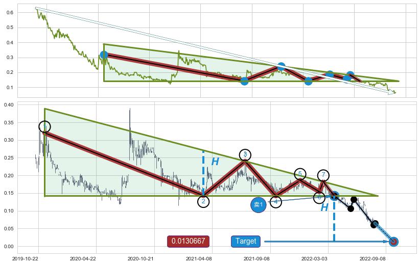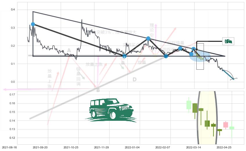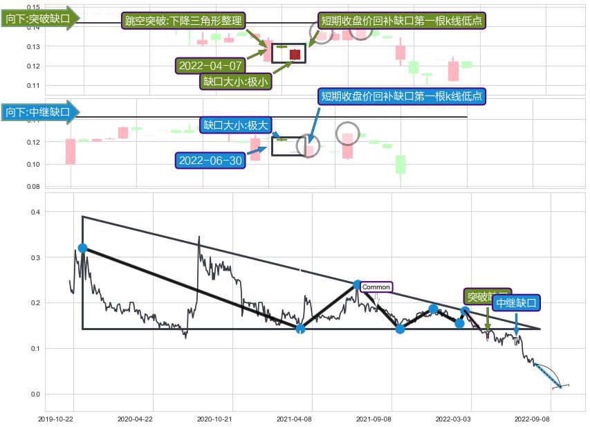 ➢ 【多方力量耗尽,空方打破攻守平衡点】下降三角形中继整理, 已在2022-03-22突破【支撑】颈线 0.142000 →演变成下降通道