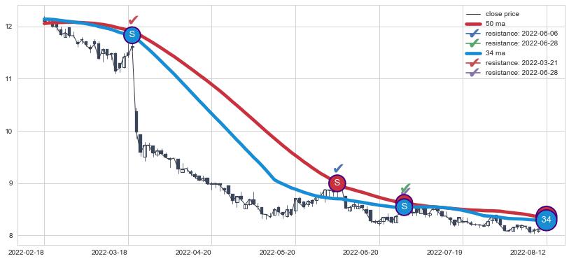 下跌趋势2022-02-18-2022-08-12,均线50, 34确认关键阻力3处