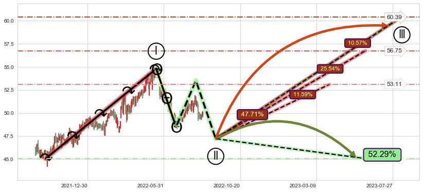 ➣ AI预测: 假定反转启动后, 第❸目标位置(2023-03-01, 54.80)