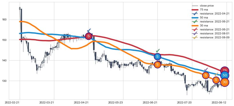 下跌趋势2022-02-21-2022-08-12,均线50, 75, 30确认关键阻力4处