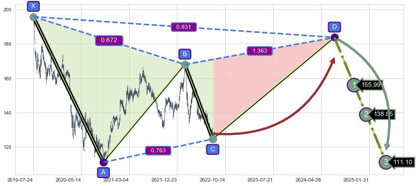 ➣ D点拟合预测价格183.74,距离最后交易收盘价格127.70相差 +43.88%