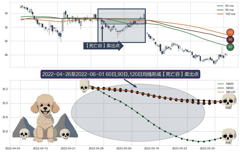 形态多维评估: ⚀ 2022-04-27-日至2022-06-01-日显现 60日-90日-120日均线 【死亡谷】卖出点 看空信号,后市看跌,卖出