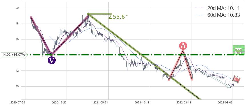 ♘ 阻力价格位14.02,可信任强度83.33%,距离最后交易2022-08-12形成的收盘价格10.30相差 +36.07%