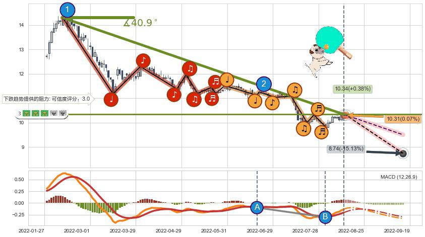 🦴 长线均值回复组合短线趋势跟踪[强阻力信号]2022-02-11-2022-08-10下跌趋势依然成立(下跌趋势跟踪依然存在),短线价格略微上行反弹(均值回复猜想),即将接近下跌趋势提供的未破位阻力价格:10.34。
