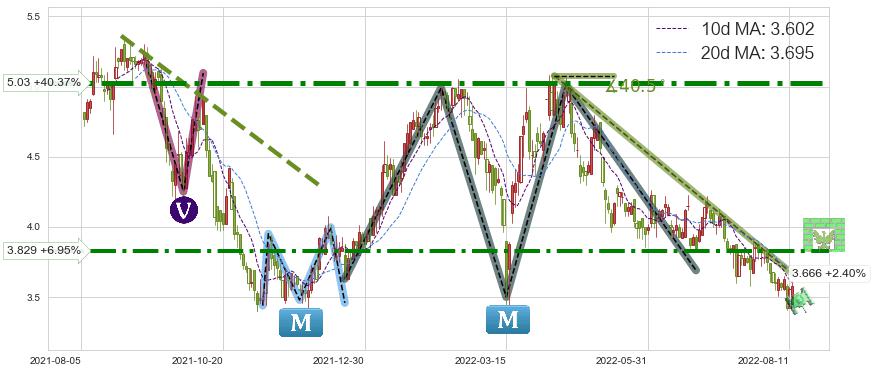 🦴 长线均值回复组合短线趋势跟踪[强阻力信号]2022-04-08-2022-08-12下跌趋势依然成立(下跌趋势跟踪依然存在),短线价格略微上行反弹(均值回复猜想),即将接近下跌趋势提供的未破位阻力价格:3.666。