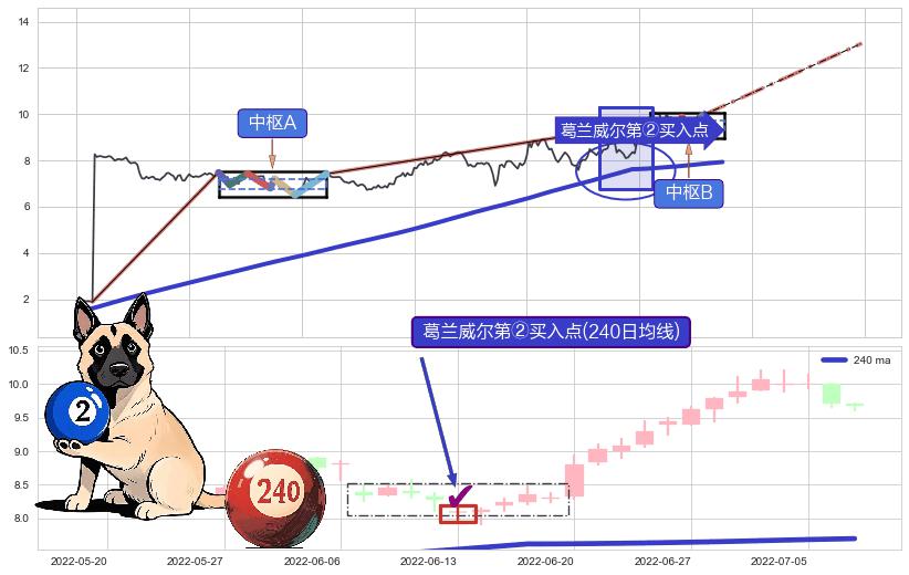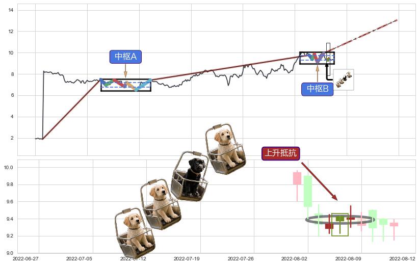 ➢ 【中枢B】:2022-07-12-2022-08-01,中枢由5笔构成,共15交易日, ZG=9.76, ZD=9.38