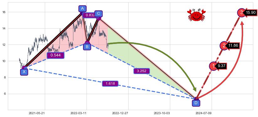 ➣ 未完成【螃蟹】形态起点X: 2020-12-22, 已到达C点: 2022-06-08, 预测最终D点: 2024-03-26, 共824交易日