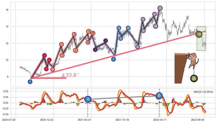 ➣ 2020-09-25-2022-03-04上升趋势存在反转[风险],其原上升趋势的支撑位(13.44)已破位[强阻力信号],原上升趋势角度: 33.8˚