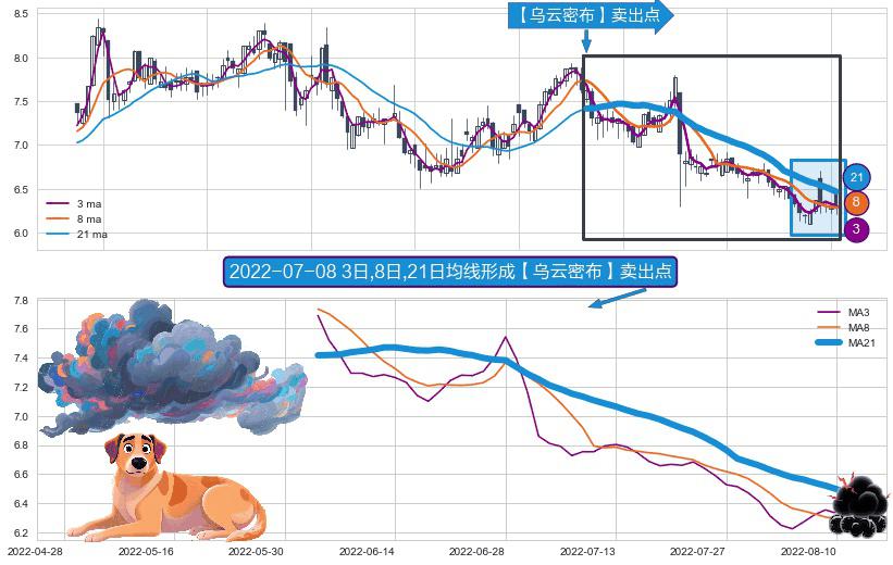 形态多维评估: ⚀ 2022-06-02日-2022-08-11日显现 3日-8日-21日均线 【乌云密布】卖出点 看空信号,后市看跌,卖出
