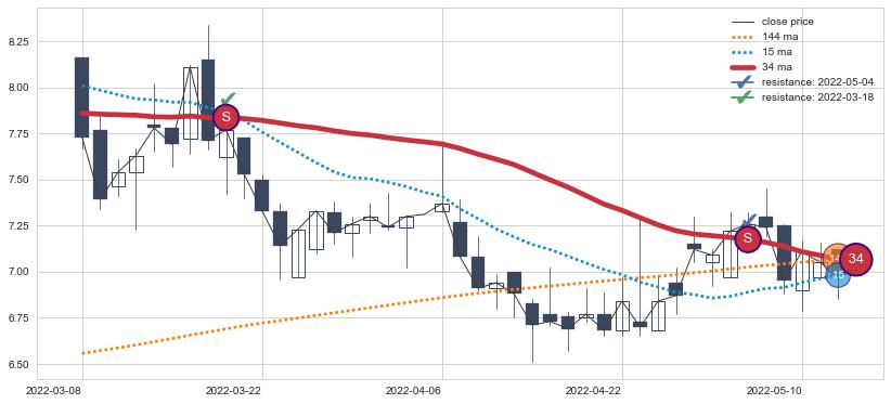 下跌趋势2022-03-08-2022-05-12,均线34确认关键阻力2处
