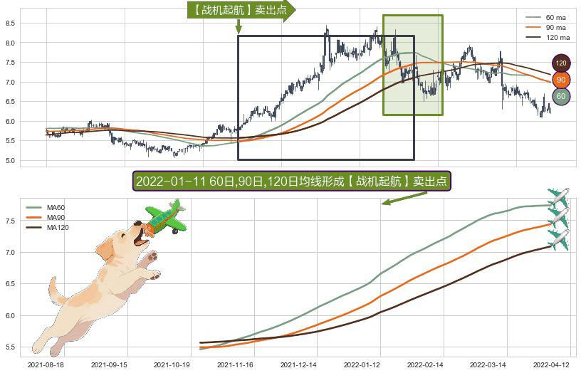 形态多维评估: ⚀ 2021-10-22日-2022-04-01日显现 60日-90日-120日均线 【战机起航】卖出点 看空信号,后市看跌,卖出